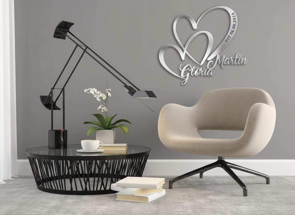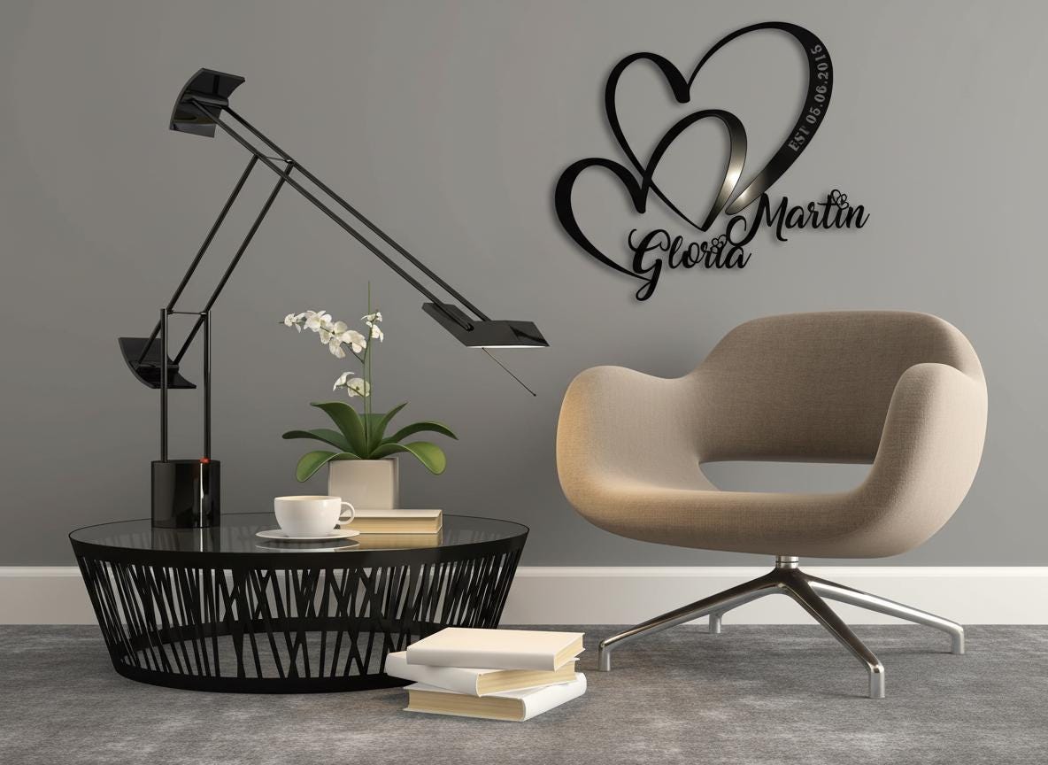 Custom couple name wall art gold metal design features two elegant intertwined hearts with your names and a special date. This personalized metal decor makes a stunning keepsake for weddings, anniversaries, engagements, or Valentine’s Day.