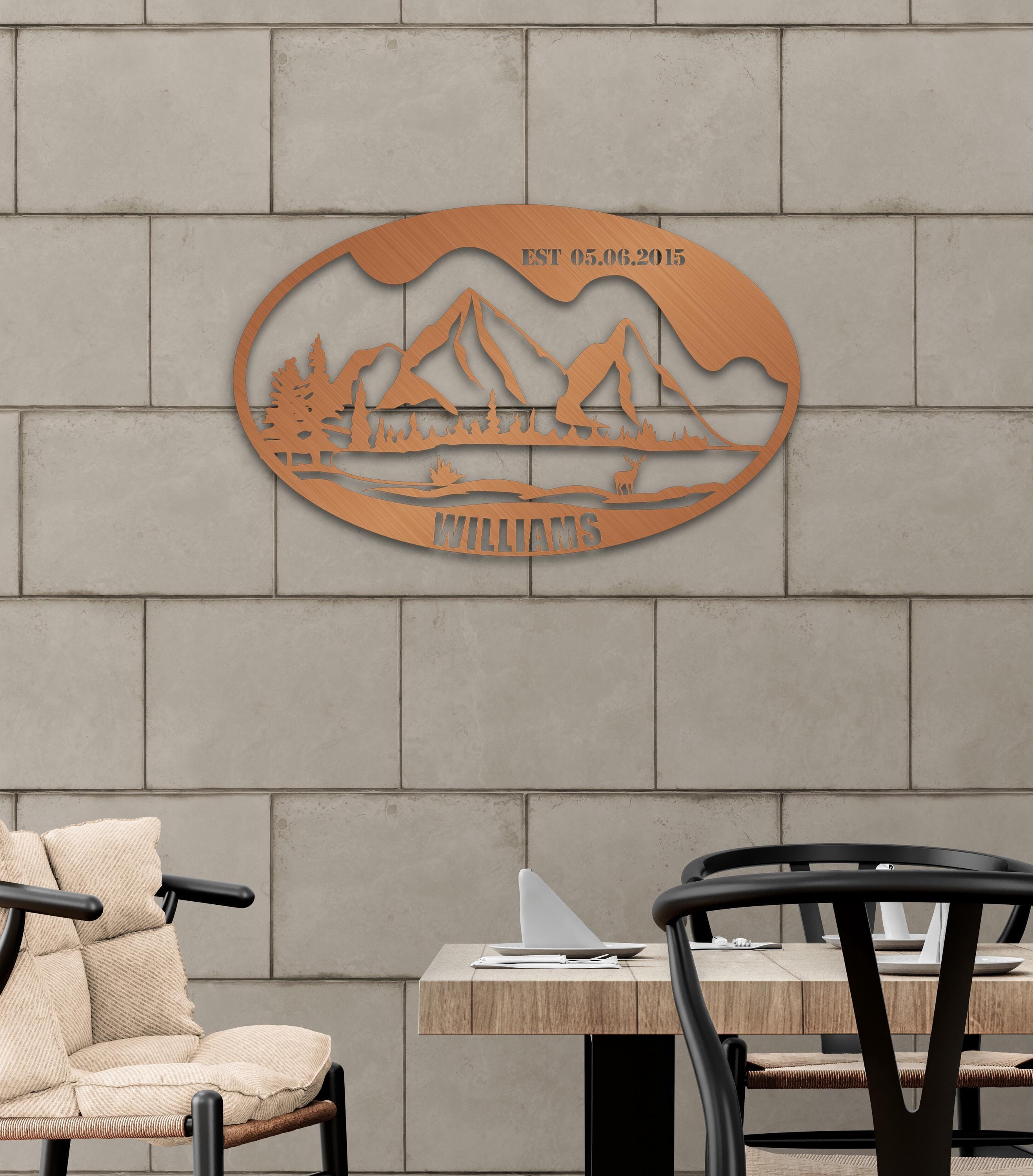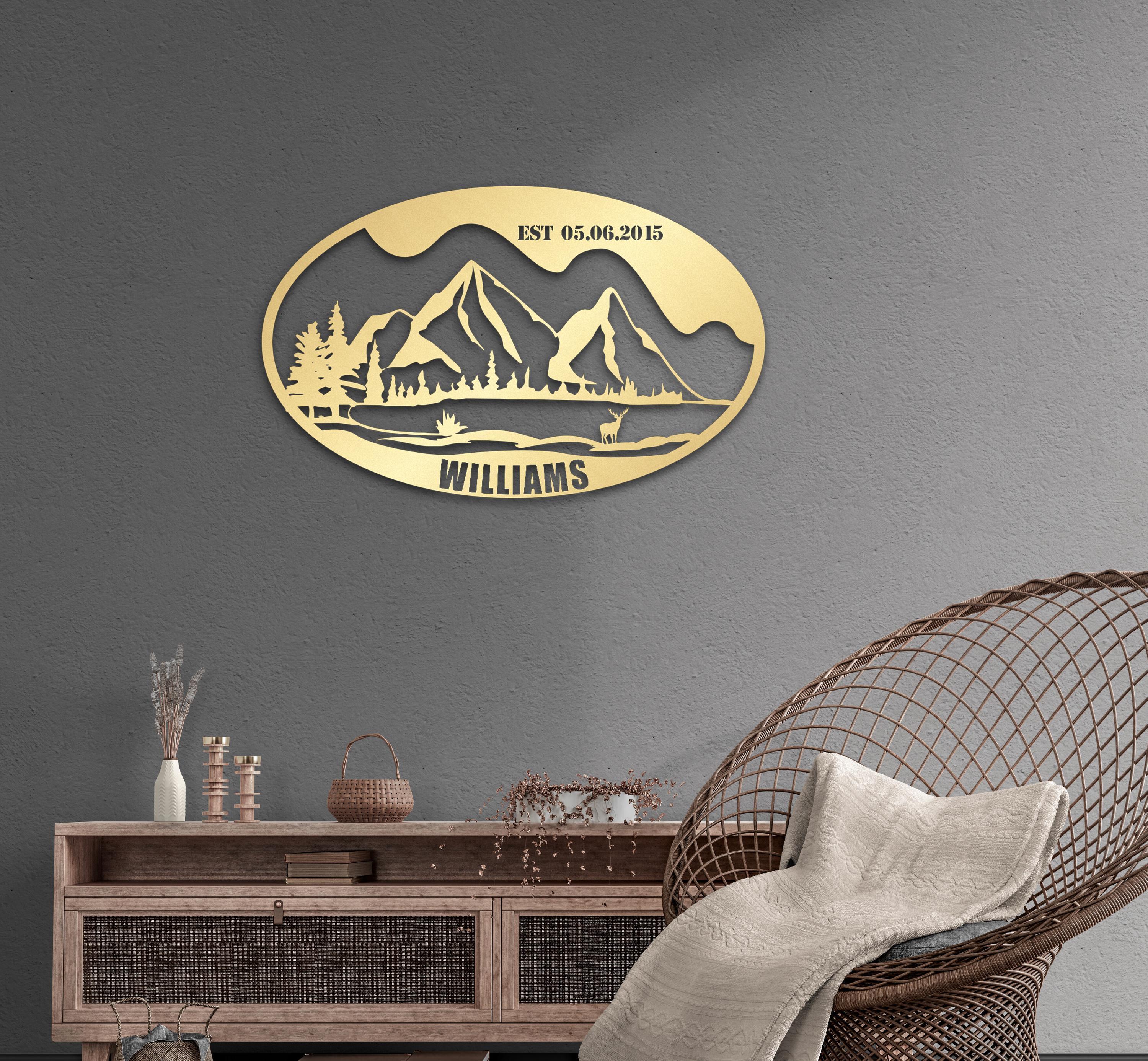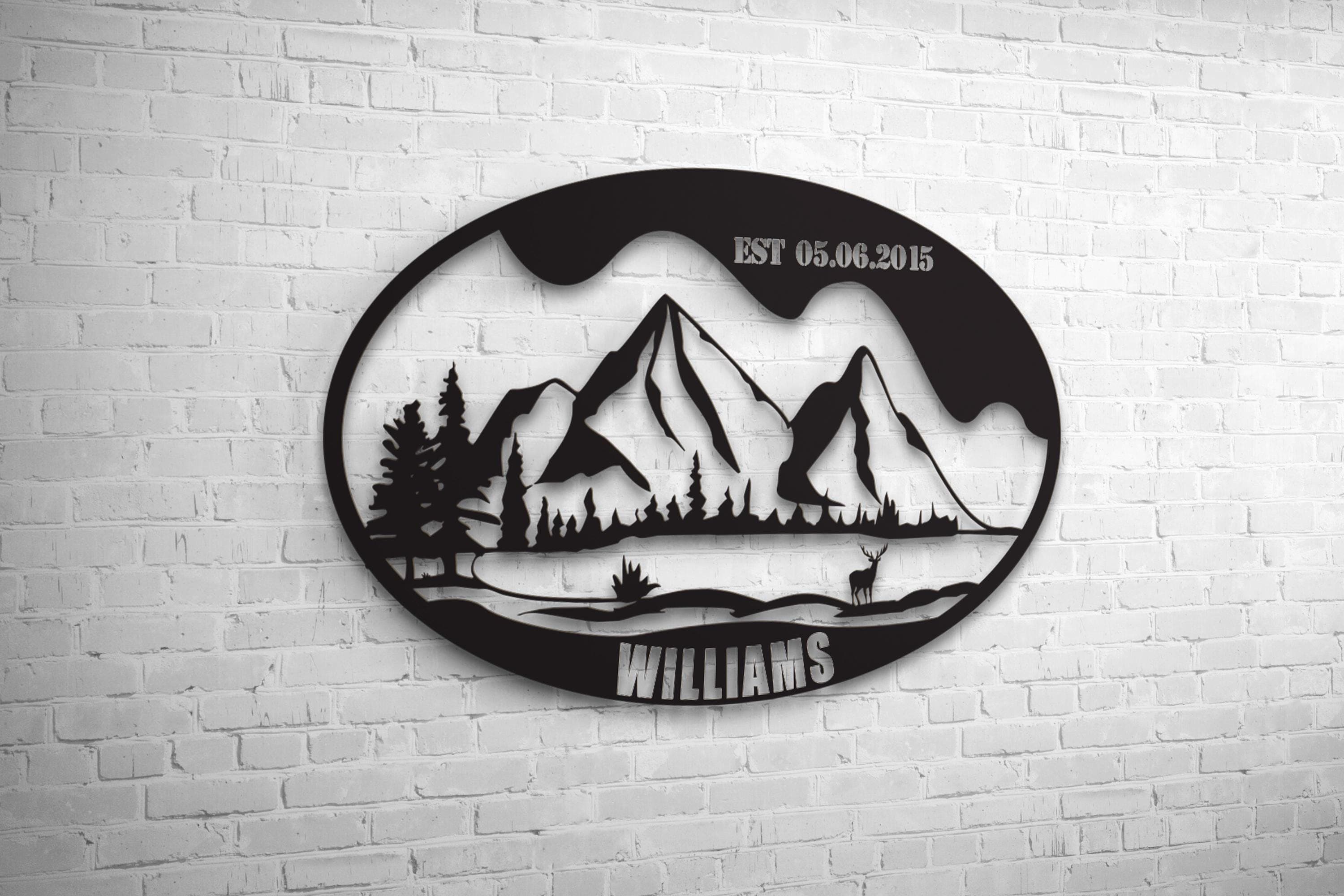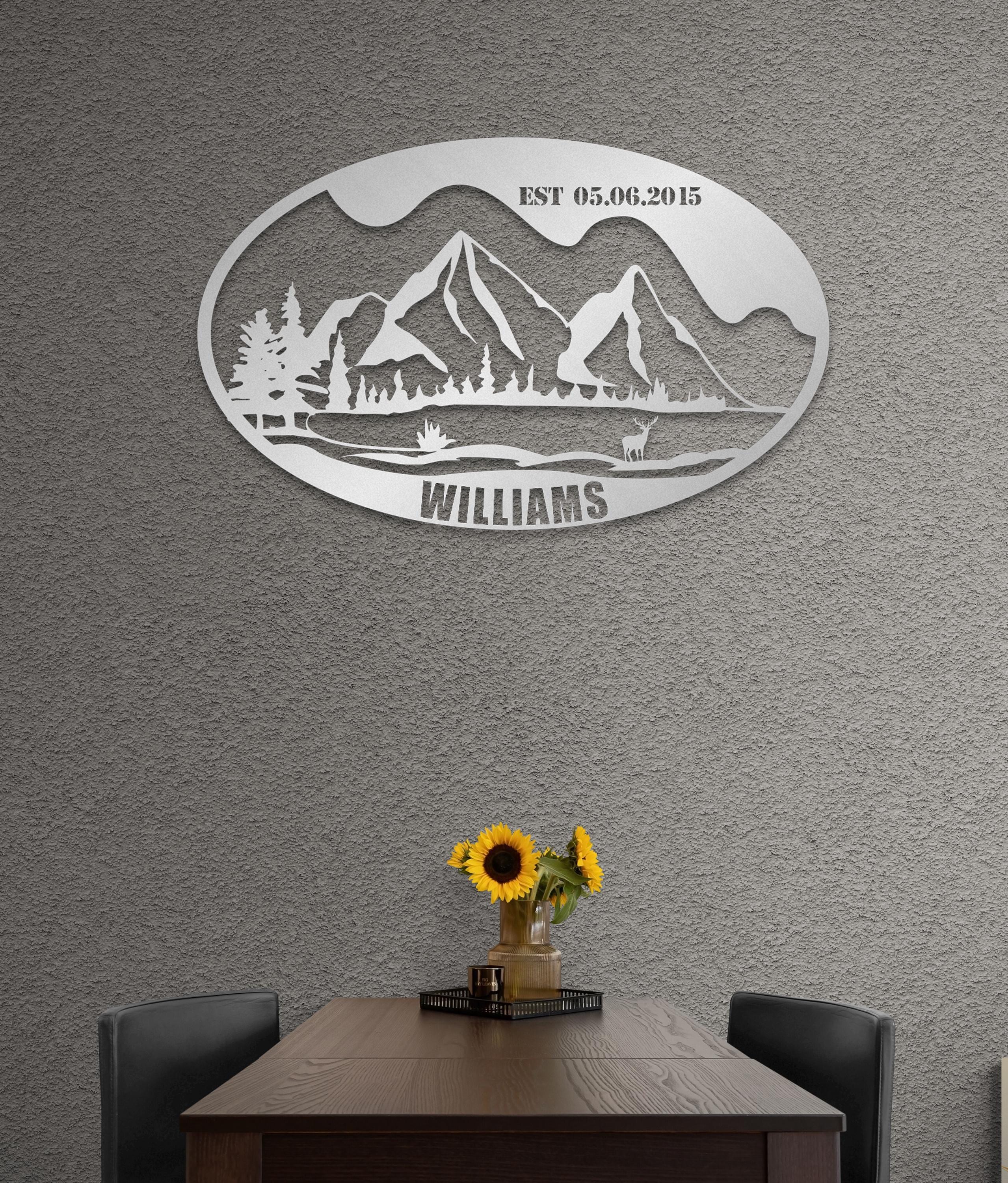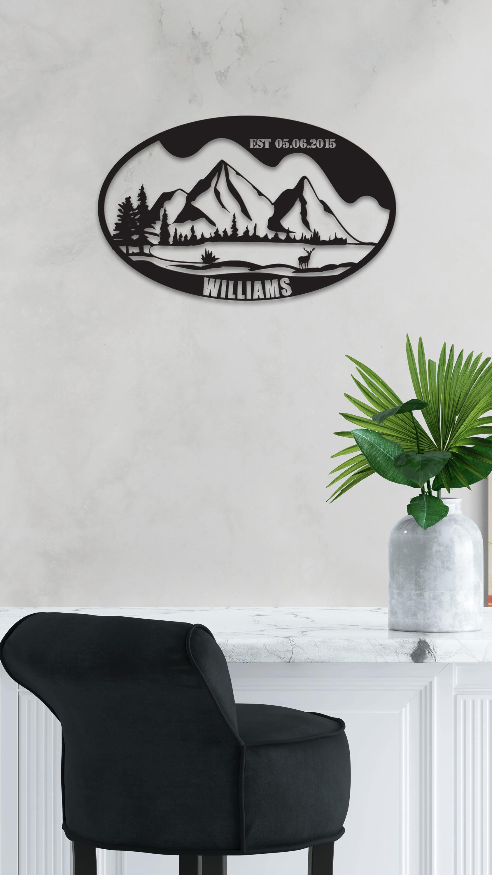Our Custom Metal Mountain and Forest Silhouette Wall Art is a stunning way to bring nature's beauty into your home. Featuring a serene mountain range, forest, and a tranquil lake with deer, this piece is fully customizable with your family name, making it the perfect personalized decor for any farmhouse or rustic-themed space. Thoughtfully crafted from high-quality metal, this sign is a unique gift for couples, newlyweds, or as a statement piece for your own home. Ideal for indoors or a protected outdoor space, this art brings warmth and charm to any setting.