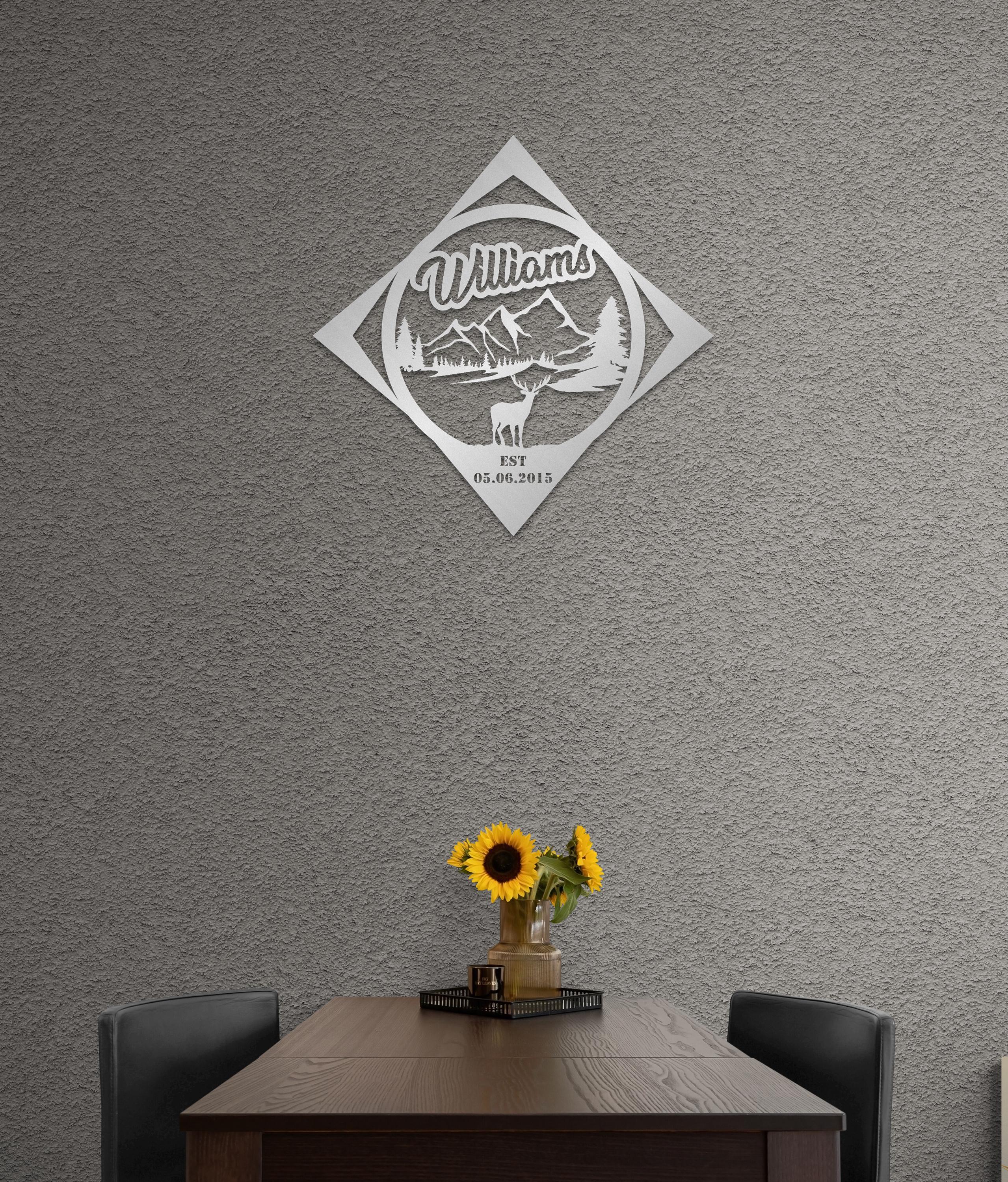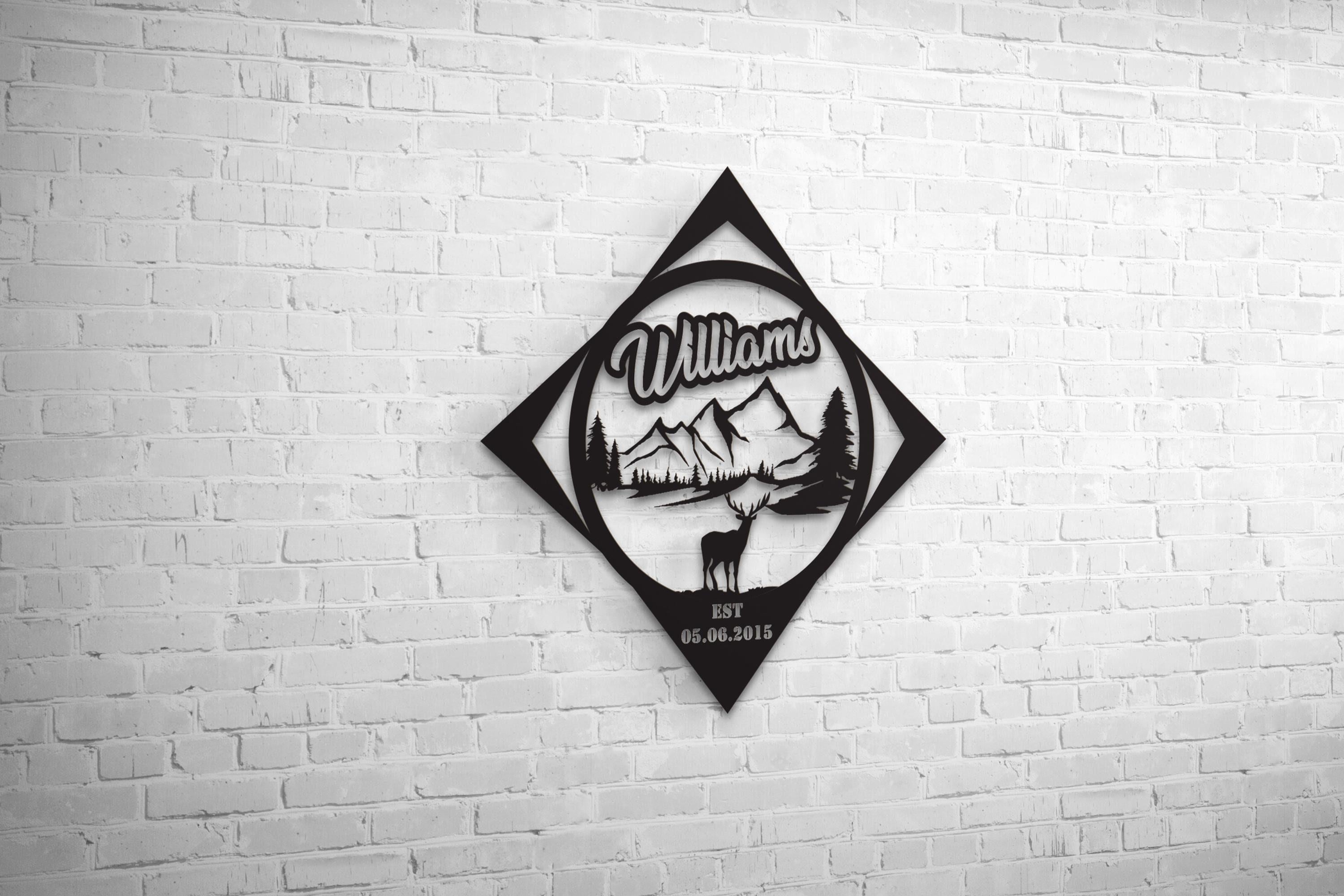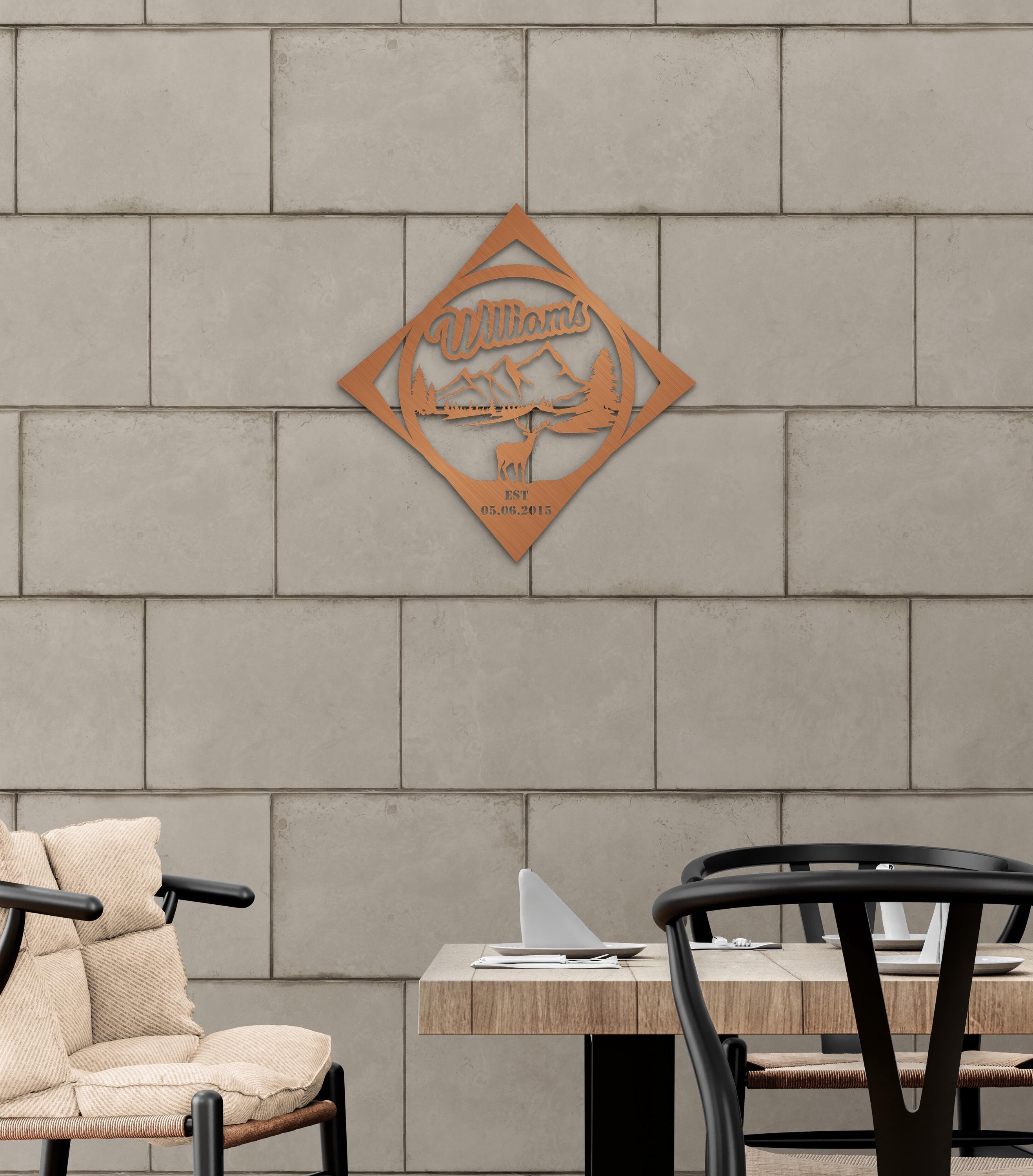 Our Custom Metal Mountain and Forest Silhouette Wall Art is a stunning way to bring nature's beauty into your home. Featuring a serene mountain range, forest, and a tranquil lake with deer, this piece is fully customizable with your family name, making it the perfect personalized decor for any farmhouse or rustic-themed space. Thoughtfully crafted from high-quality metal, this sign is a unique gift for couples, newlyweds, or as a statement piece for your own home. Ideal for indoors or a protected outdoor space, this art brings warmth and charm to any setting.