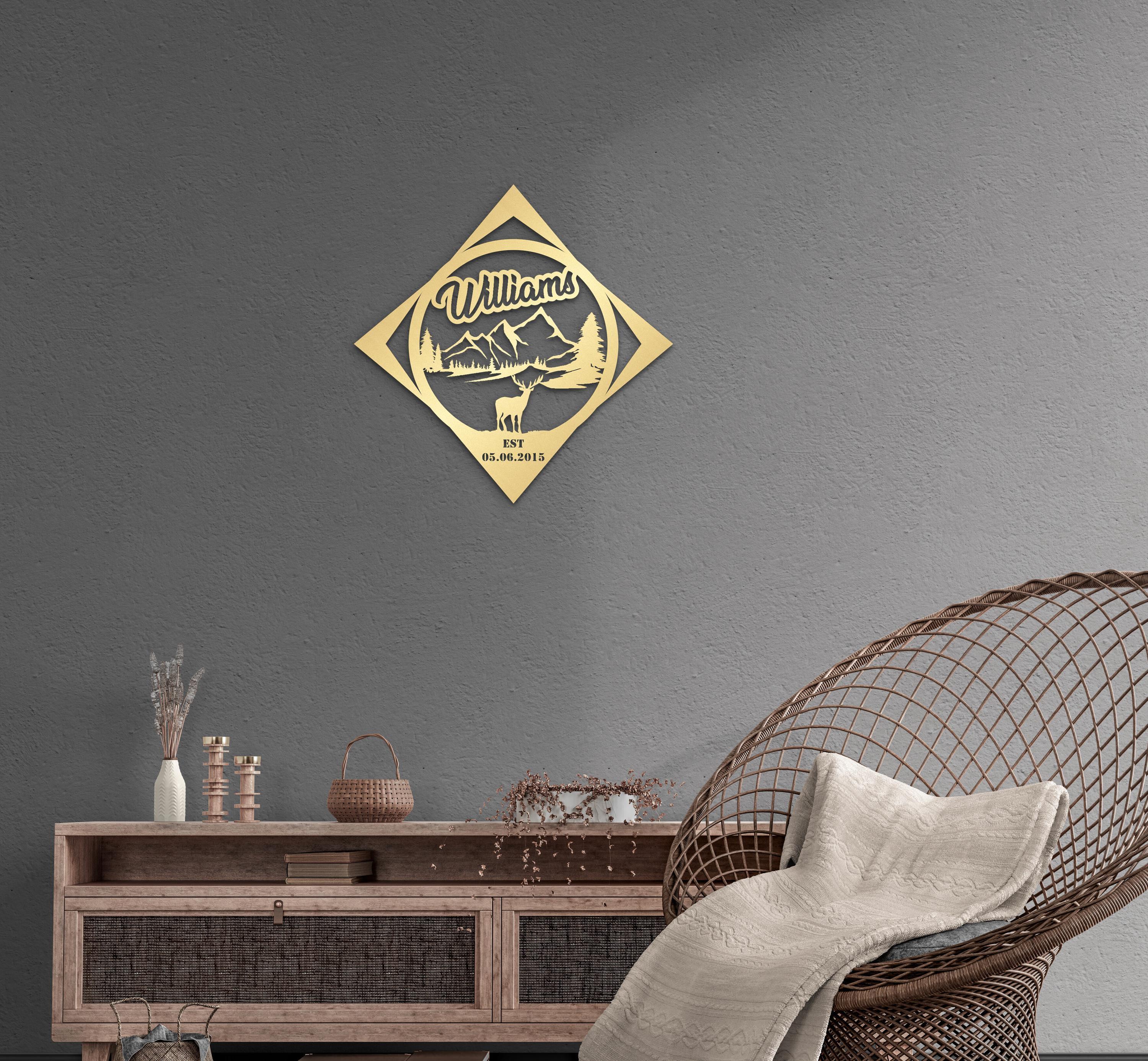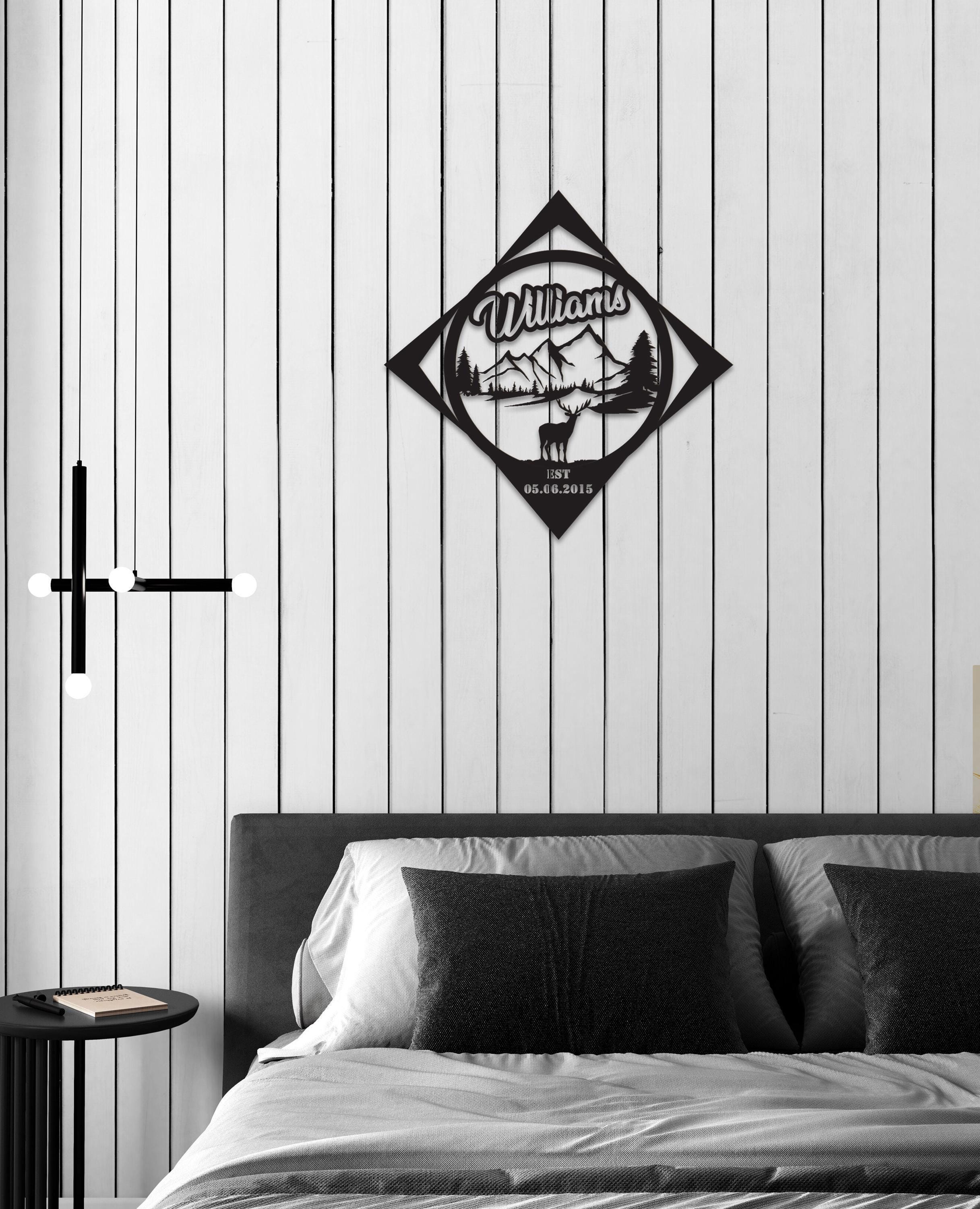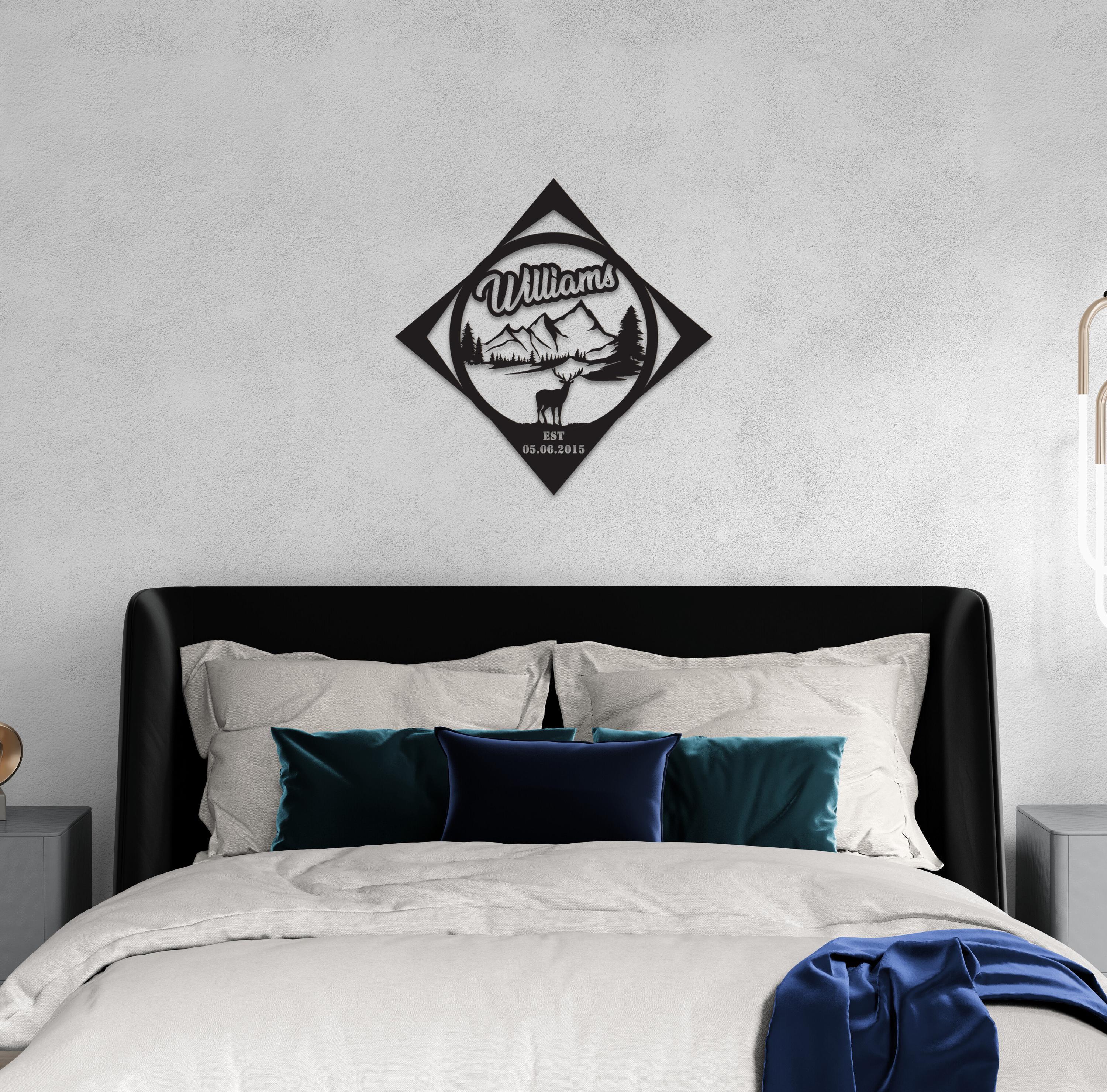 Our Custom Metal Mountain and Forest Silhouette Wall Art is a stunning way to bring nature's beauty into your home. Featuring a serene mountain range, forest, and a tranquil lake with deer, this piece is fully customizable with your family name, making it the perfect personalized decor for any farmhouse or rustic-themed space. Thoughtfully crafted from high-quality metal, this sign is a unique gift for couples, newlyweds, or as a statement piece for your own home. Ideal for indoors or a protected outdoor space, this art brings warmth and charm to any setting.